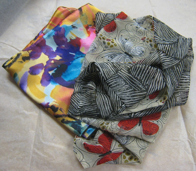 Figure 8 scarves have been all over print and media blogs and advertising for the past year. They can be expensive to buy but inexpensive to make. Before Christmas I was in the fabric store fondling browsing the fabric remnants and found some fabric that I knew would make lovely scarves. This type of fabric can be fussy to work with. It stretches, frays and distorts easily but it will also produce a satisfying project. Figure 8 scarves are just that. A long strip of fabric with a twist in the middle so it forms a continuous loop. Kind of like a Möbius strip. I found several coordinating remnants and also a couple of wider one color pieces and made scarves. It was fun and I do think the girls were pleased. These scarves are stylish and add some warmth to these cool winter days.
